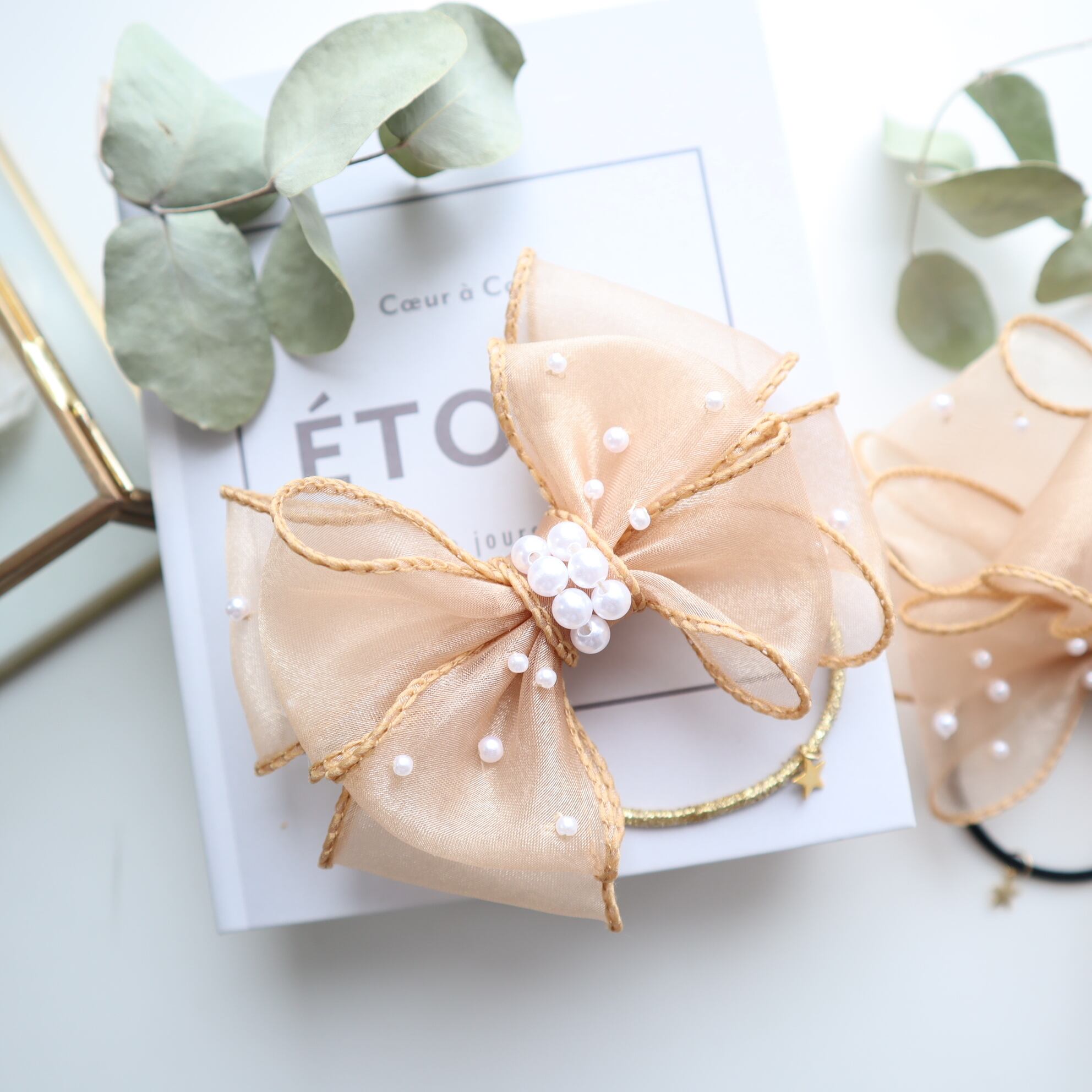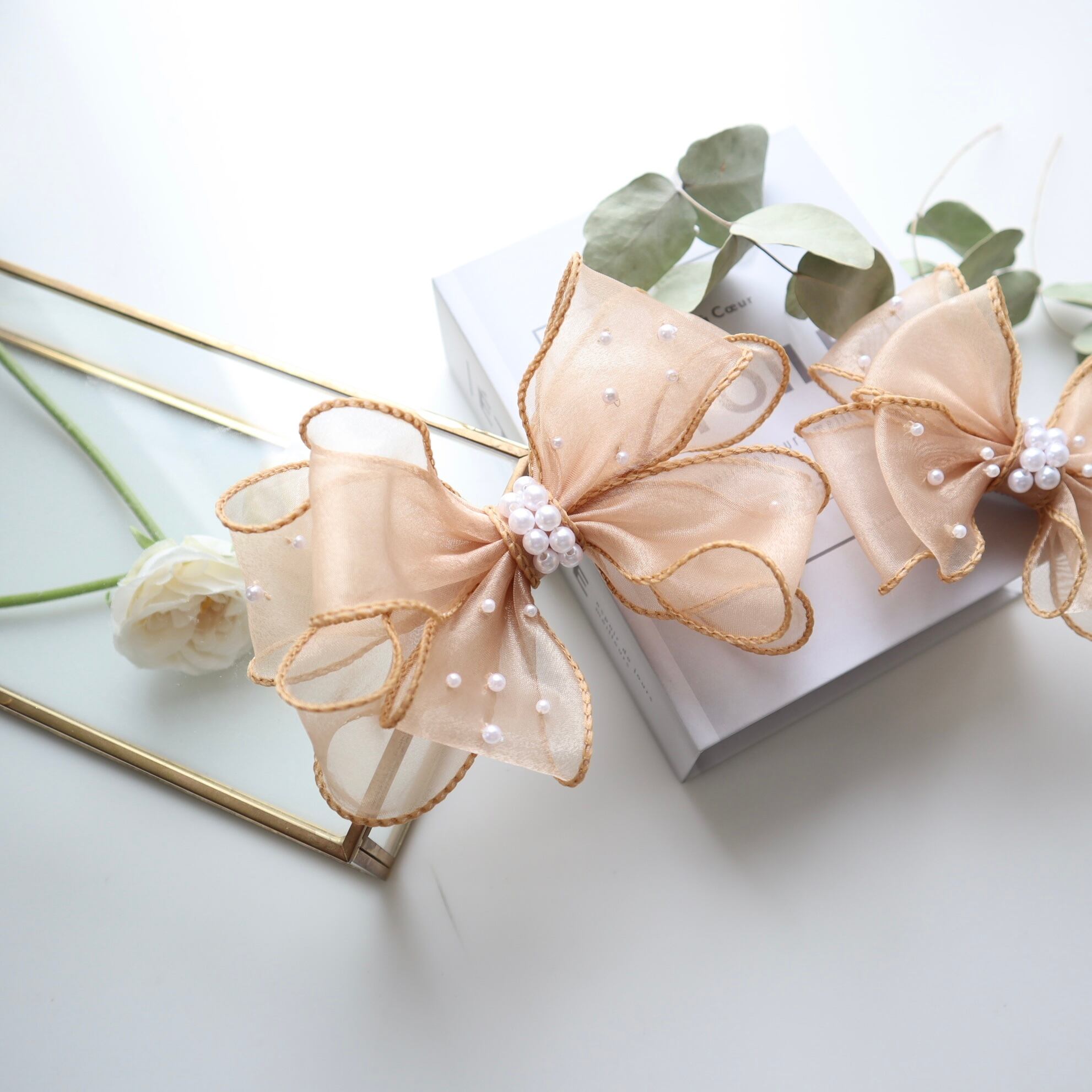 パールリボンとオーガンジーの組み合わせは本当に上品で、大人可愛い印象を与えます♡