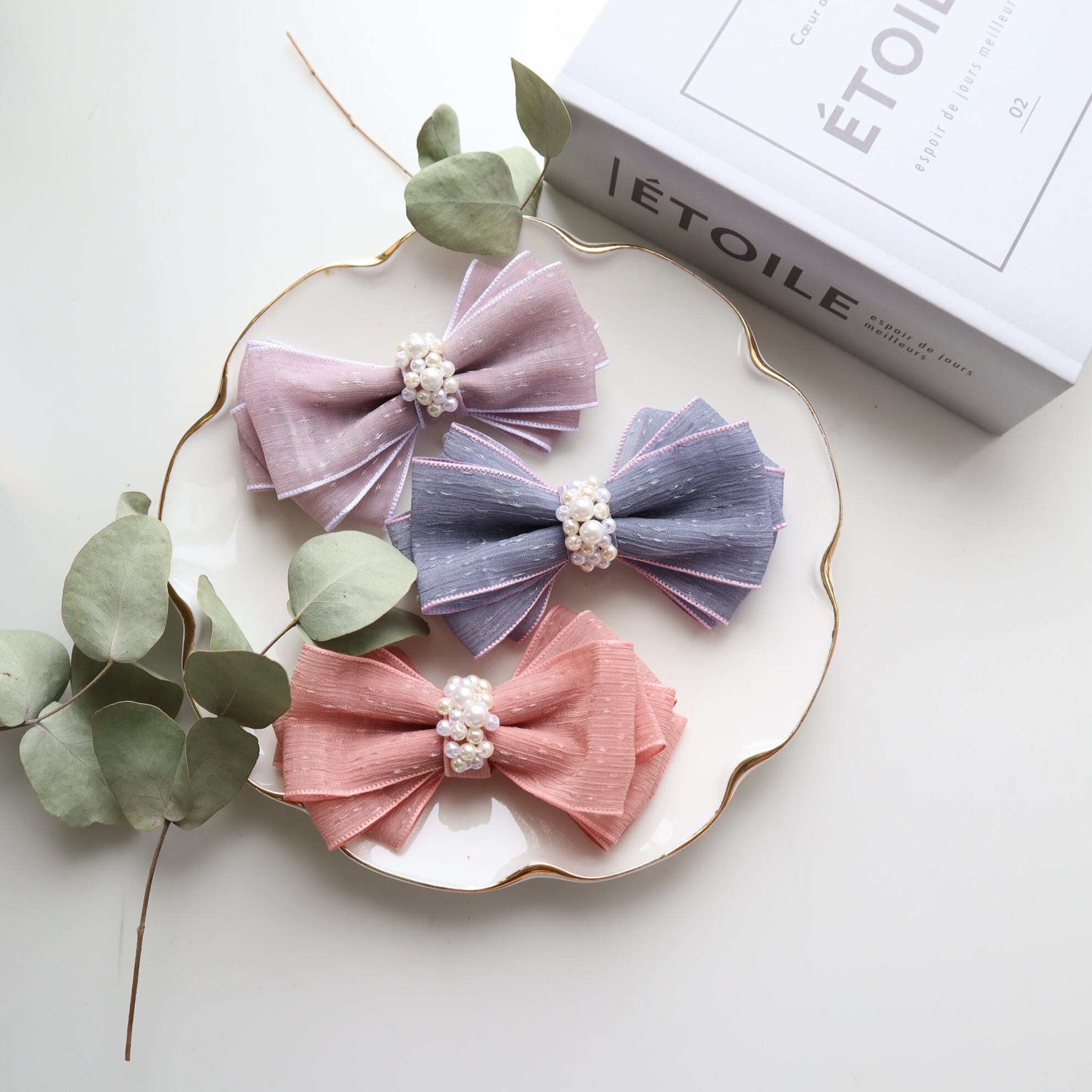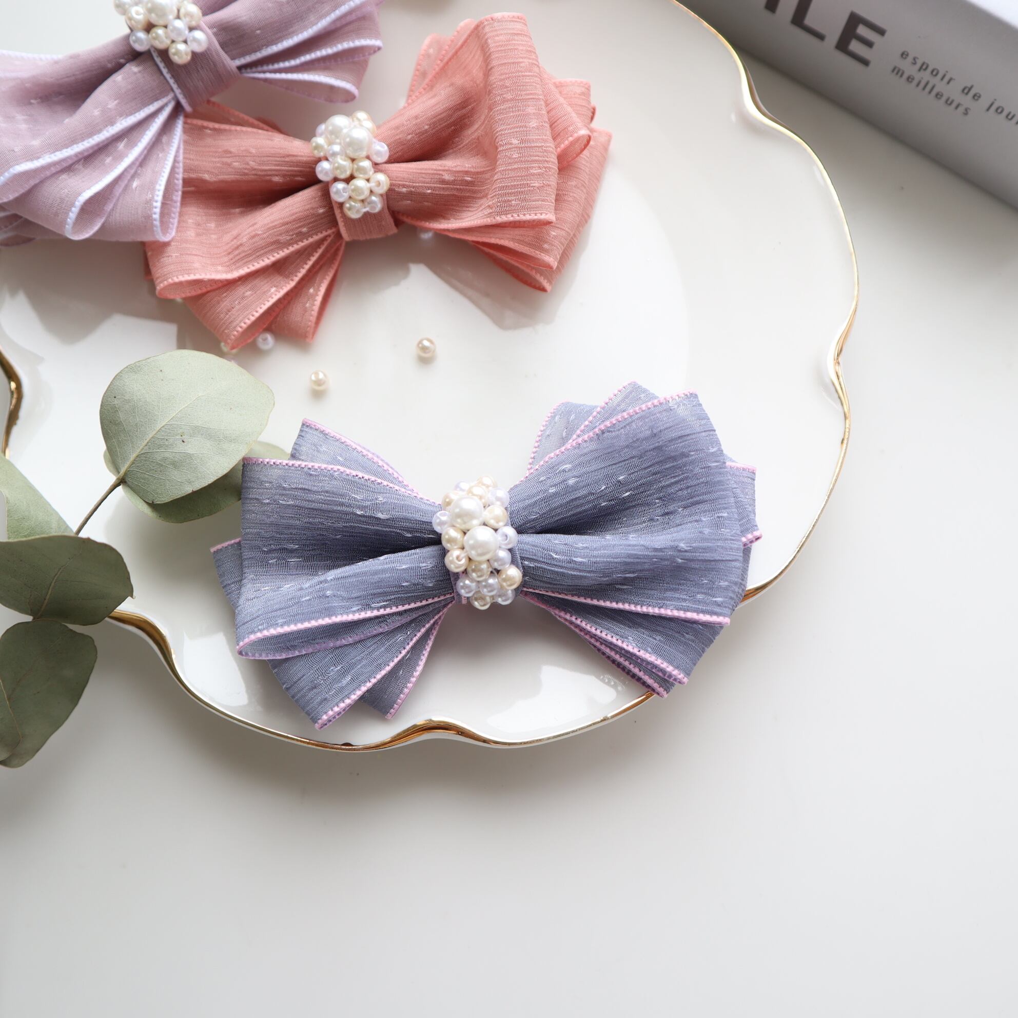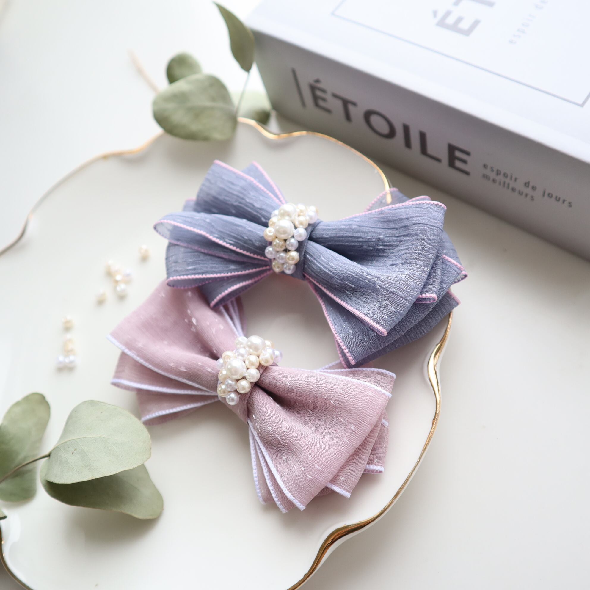 キャッチーなくすみカラーにパールが輝くリボン♡