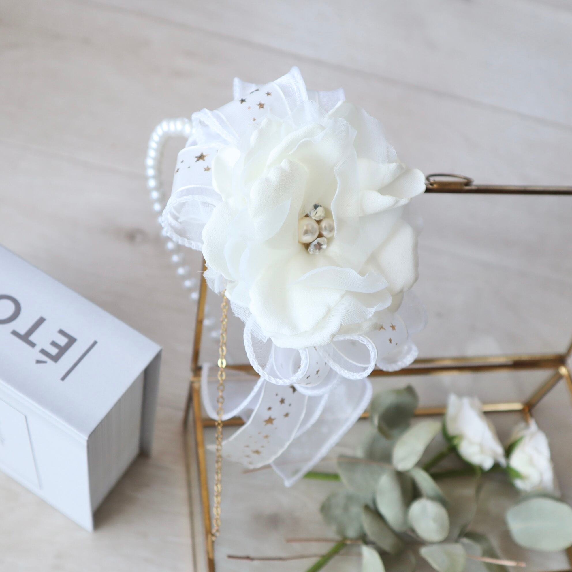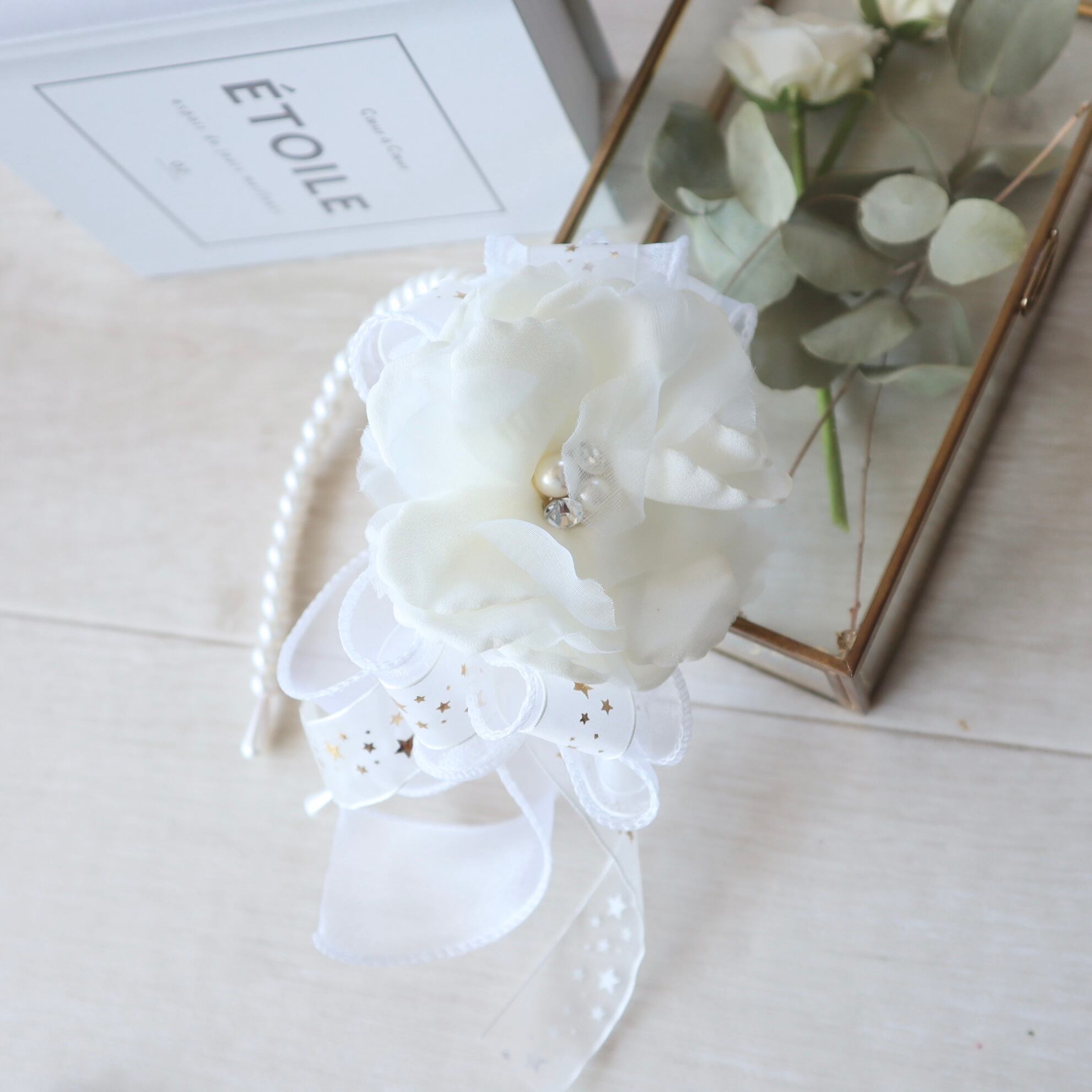 星柄オーガンジー素材の美しいリボンと中央の可愛らしいお花が特徴。パールカチューシャがさらに上品な印象を与えてくれます♡