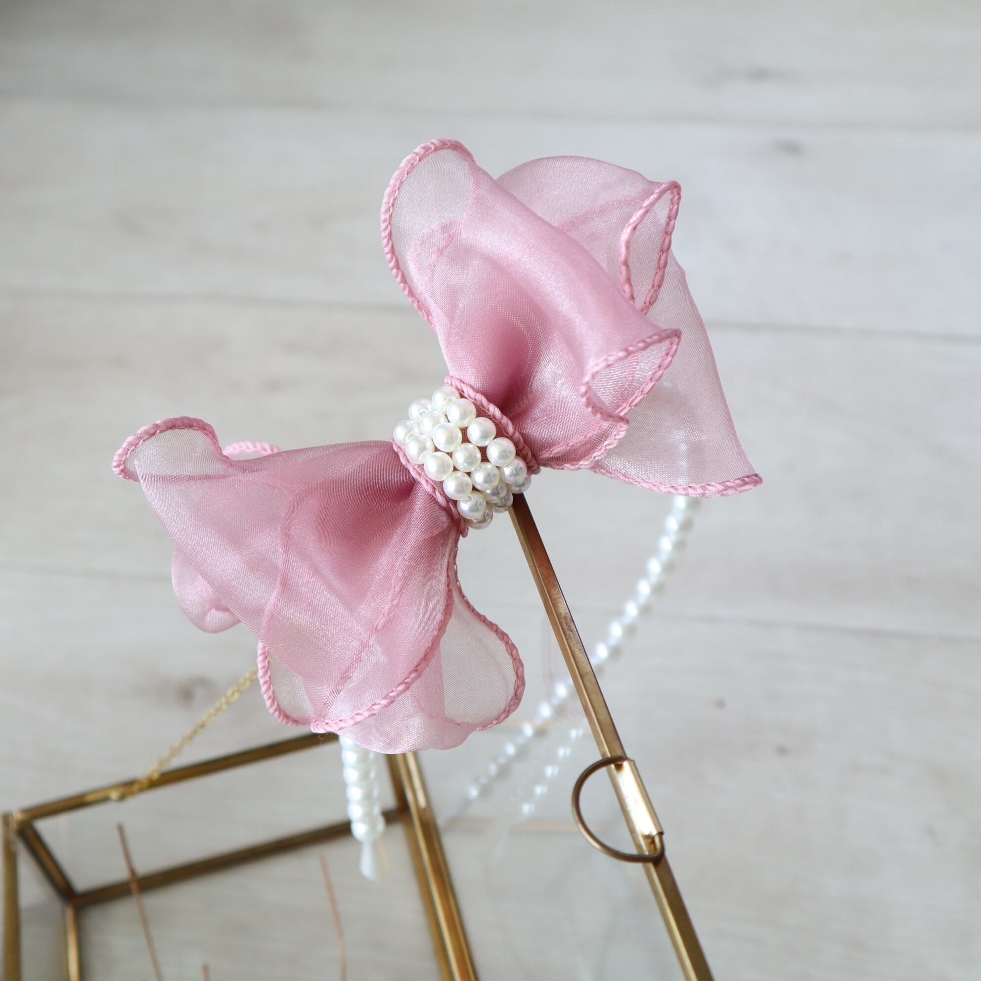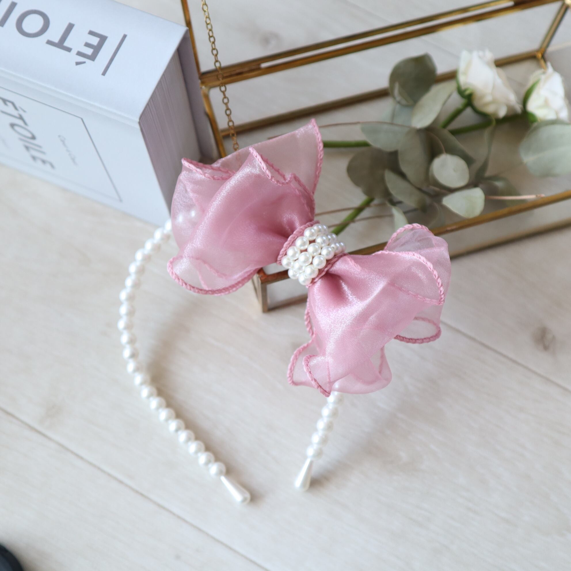 オーガンジーパールリボンカチューシャ くすみピンク ヘアアクセサリー ヘッドドレス キッズアクセサリー 入学式